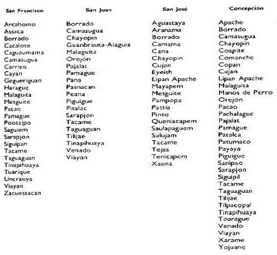 Maria Esther Dominguez, in her book, San Antonio, Tejas, en la Epoca Colonial (1718-1821), lists the following indian tribes or bands at the San Antonio missions. This does not include San Antonio de Valero, or the Alamo, that had various tribes including Lipan Apaches.